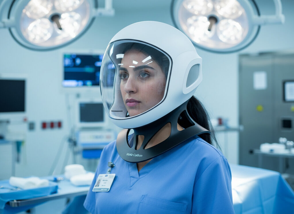 Sterile-field breathing system for surgical teams, with AI-stabilised airflow and optical integration designed for long procedures and sustained focus.